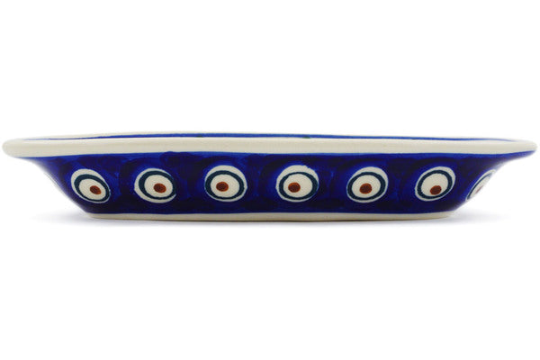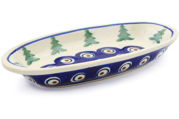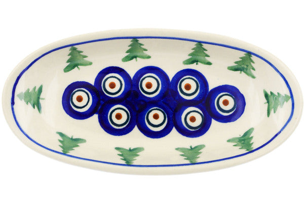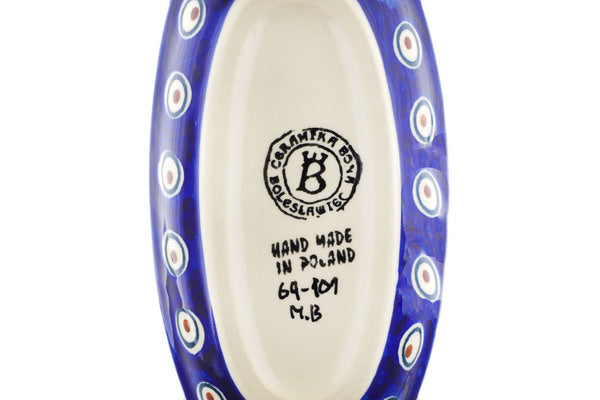 This Polish Pottery Condiment Dish is handmade and handpainted by the Ceramika Bona factory in Boleslawiec, Poland. Manufacturer item number H8804E. It is 1" high and measures 6½" by 3¼". The capacity of this Condiment Dish is 4.23 oz (brimful) and it weighs 0.4 lbs. It is part of the Peacock Pines Collection.
