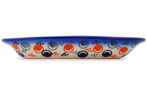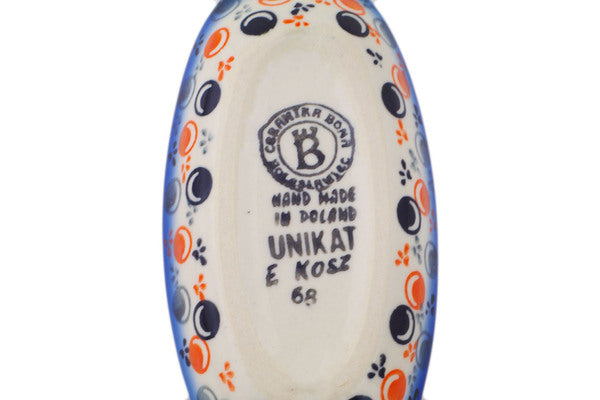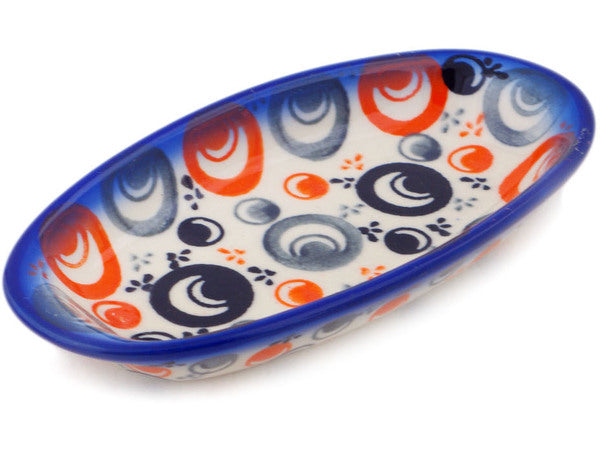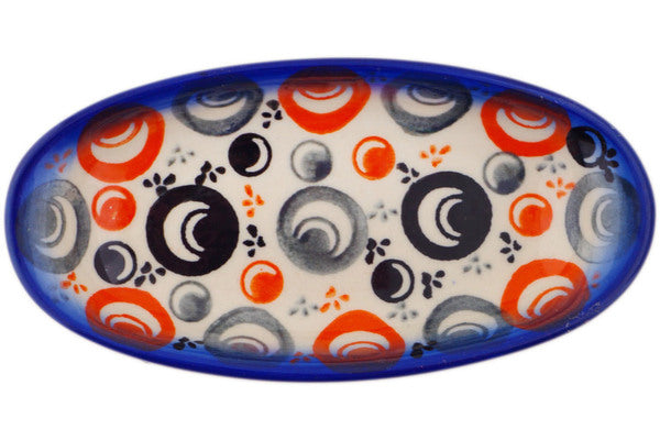 This Polish Pottery Condiment Dish is handmade and handpainted by the Ceramika Bona factory in Boleslawiec, Poland. Manufacturer item number H7129Q. It is 1" high and measures 5¾" by 2¾". The capacity of this Condiment Dish is 3.38 oz (brimful) and it weighs 0.3 lbs. It is part of the Red Peacock Eye Collection.