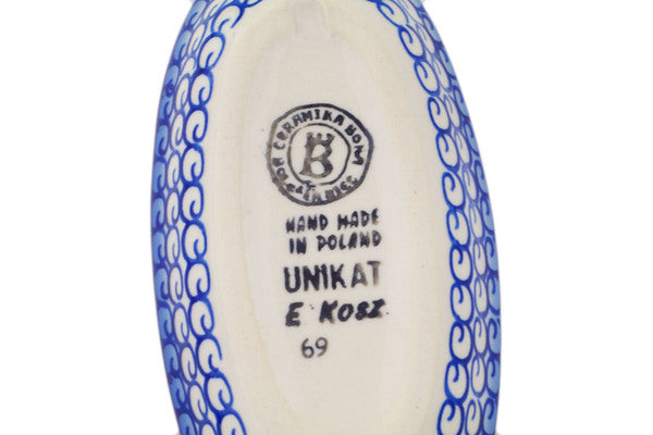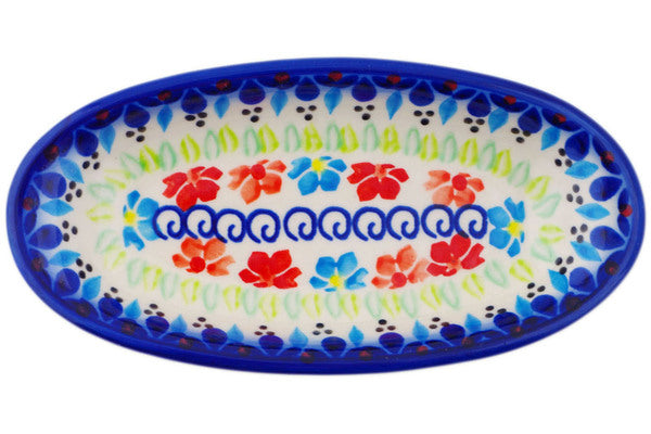 This Polish Pottery Condiment Dish is handmade and handpainted by the Ceramika Bona factory in Boleslawiec, Poland. Manufacturer item number H3071Q. It is 1" high and measures 6½" by 3¼". The capacity of this Condiment Dish is 4.23 oz (brimful) and it weighs 0.4 lbs. It is part of the Spring Flowers Collection.