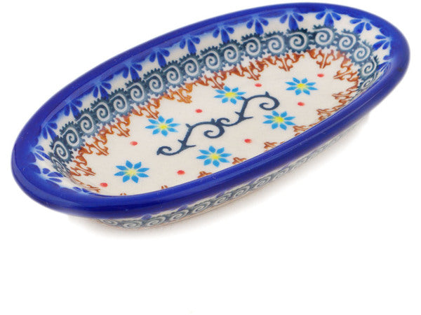 This Polish Pottery Condiment Dish is handmade and handpainted by the Ceramika Bona factory in Boleslawiec, Poland. Manufacturer item number H4435Q. It is 1" high and measures 6½" by 3¼". The capacity of this Condiment Dish is 4.23 oz (brimful) and it weighs 0.4 lbs. It is part of the Sunflower Dance Collection.