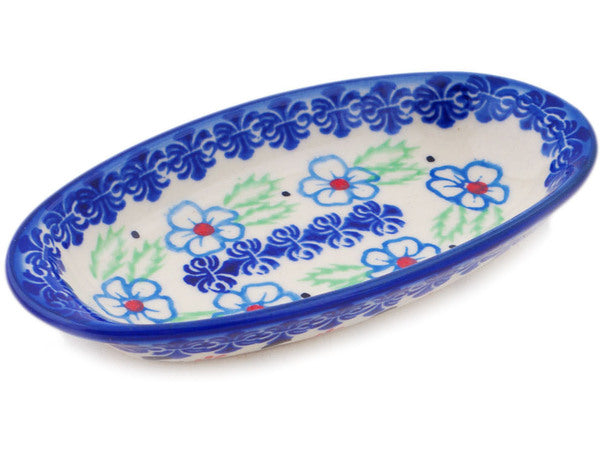 This Polish Pottery Condiment Dish is handmade and handpainted by the Ceramika Bona factory in Boleslawiec, Poland. Manufacturer item number H2002R. It is 1" high and measures 5¾" by 2¾". The capacity of this Condiment Dish is 3.38 oz (brimful) and it weighs 0.3 lbs. It is part of the Sweet Day Collection.