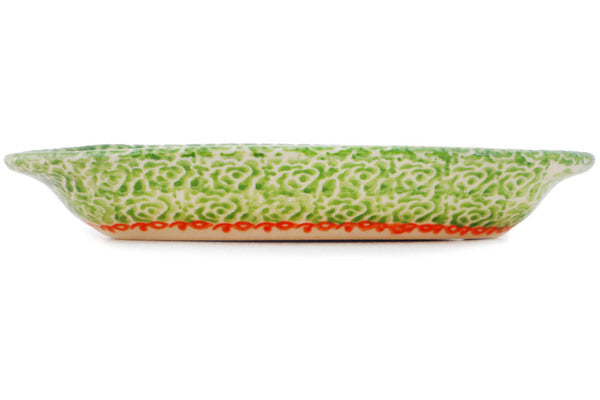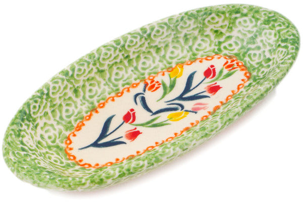 This Polish Pottery Condiment Dish is handmade and handpainted by the Ceramika Bona factory in Boleslawiec, Poland. Manufacturer item number H3668P. It is 1" high and measures 6½" by 3¼". The capacity of this Condiment Dish is 4.23 oz (brimful) and it weighs 0.4 lbs. It is part of the Tulip Ring Collection.