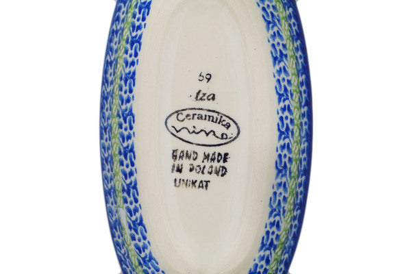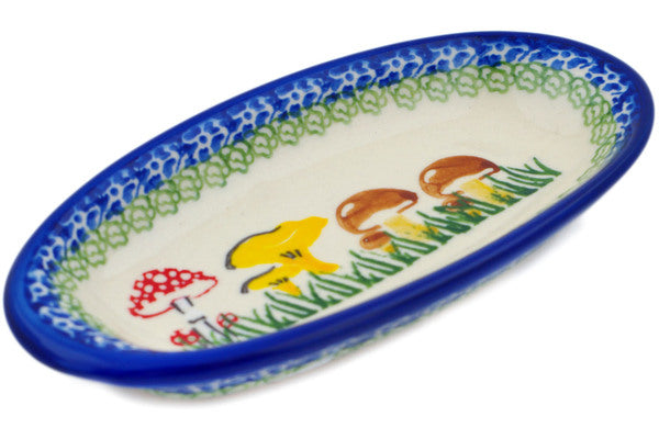 This Polish Pottery Condiment Dish is handmade and handpainted by the Ceramika Nina factory in Boleslawiec, Poland. Manufacturer item number H1648P. It is 1" high and measures 6½" by 3¼". The capacity of this Condiment Dish is 4.23 oz (brimful) and it weighs 0.4 lbs. It is part of the Wild Mushroom Picking Collection.