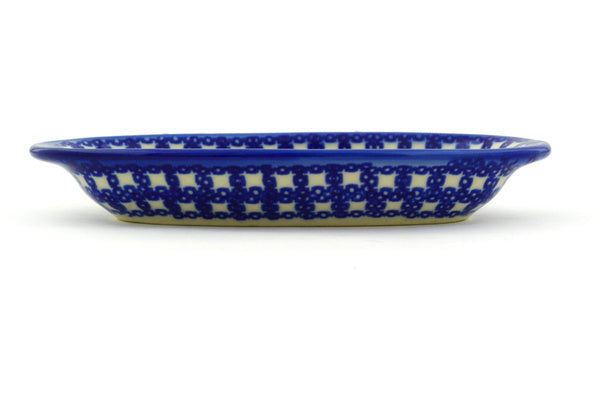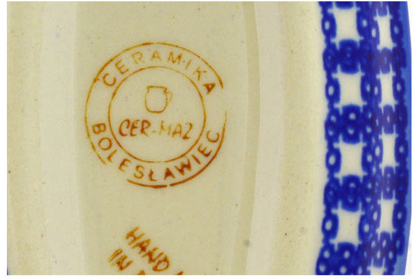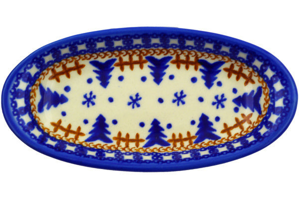 This Polish Pottery Condiment Dish is handmade and handpainted by the Ceramika Bona factory in Boleslawiec, Poland. Manufacturer item number H8739E. It is 1" high and measures 6½" by 3¼". The capacity of this Condiment Dish is 4.23 oz (brimful) and it weighs 0.4 lbs. It is part of the Winter Snow Collection.