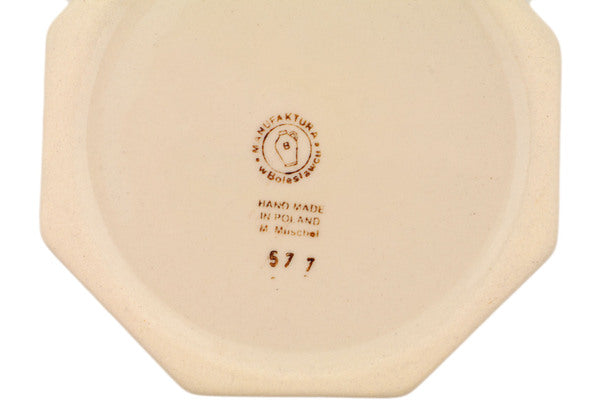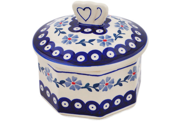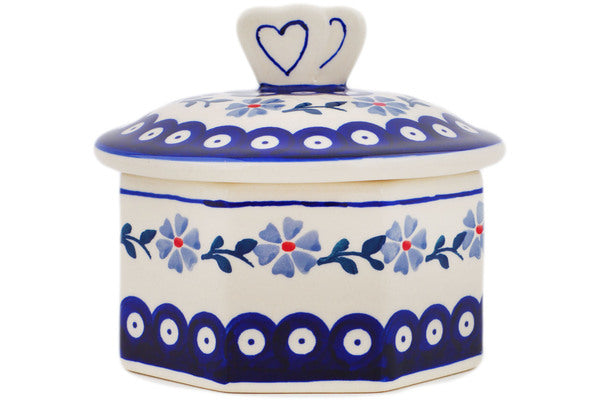 This Polish Pottery Cookie Jar is handmade and handpainted by the Manufaktura factory in Boleslawiec, Poland. Manufacturer item number H7291O. It is 5" high and measures 5¾" by 5¾". The capacity of this Cookie Jar is 22.86 oz (brimful) and it weighs 1.6 lbs. It is part of the Peacock Forget-Me-Not Collection.