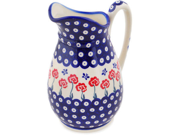 This Polish Pottery Pitcher is handmade and handpainted by the Ceramika Bona factory in Boleslawiec, Poland. Manufacturer item number H0200P. It is 8¾" high and measures 6¾" by 5½". The capacity of this Pitcher is 53.76 oz (brimful) and it weighs 2.4 lbs. It is part of the Blue Eye Spring Collection.