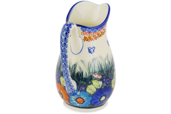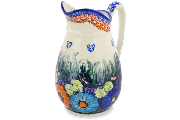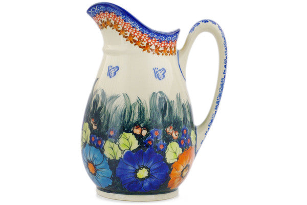 This Polish Pottery Pitcher is handmade and handpainted by the Ceramika Bona factory in Boleslawiec, Poland. Manufacturer item number H4213J. It is 8¾" high and measures 6¾" by 5½". The capacity of this Pitcher is 53.76 oz (brimful) and it weighs 2.4 lbs. It is part of the Butterfly Splendor Collection.