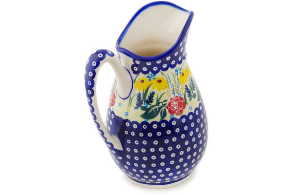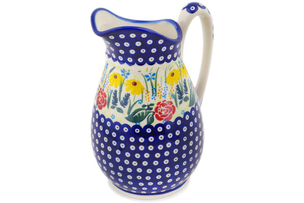 This Polish Pottery Pitcher is handmade and handpainted by the Ceramika Bona factory in Boleslawiec, Poland. Manufacturer item number H0121P. It is 8¾" high and measures 6¾" by 5½". The capacity of this Pitcher is 53.76 oz (brimful) and it weighs 2.4 lbs. It is part of the Summer's Garden Collection.