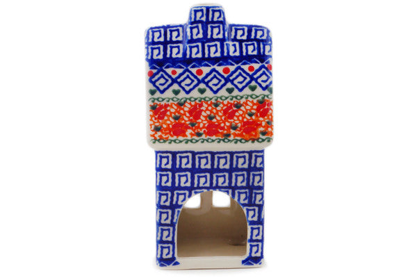 This Polish Pottery House Shaped Candle Holder is handmade and handpainted by the Ceramika Bona factory in Boleslawiec, Poland. Manufacturer item number H9746Q. It is 6½" high and measures 3" by 2¾". The weight of this House Shaped Candle Holder is 0.8 lbs. It is part of the Grecian Fire Tulips Collection.