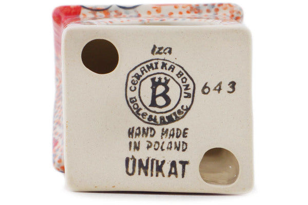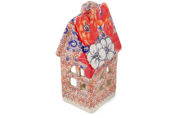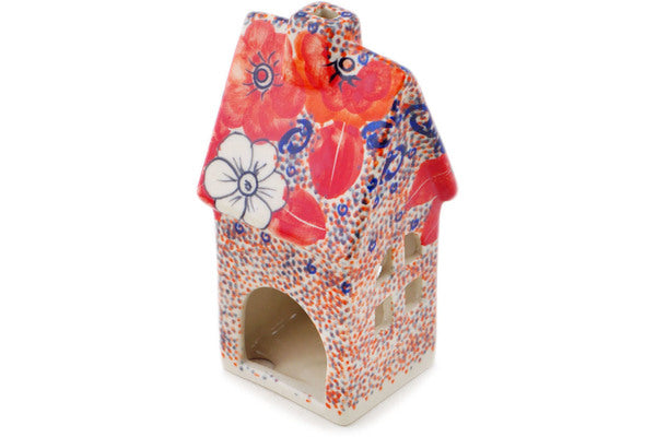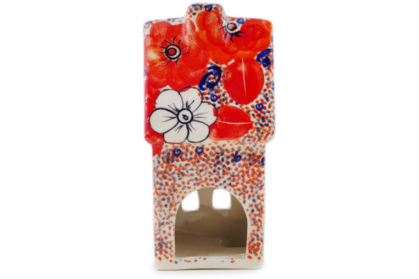 This Polish Pottery House Shaped Candle Holder is handmade and handpainted by the Ceramika Bona factory in Boleslawiec, Poland. Manufacturer item number H7184Q. It is 6½" high and measures 3" by 2¾". The weight of this House Shaped Candle Holder is 0.8 lbs. It is part of the Poppy Passion Collection.