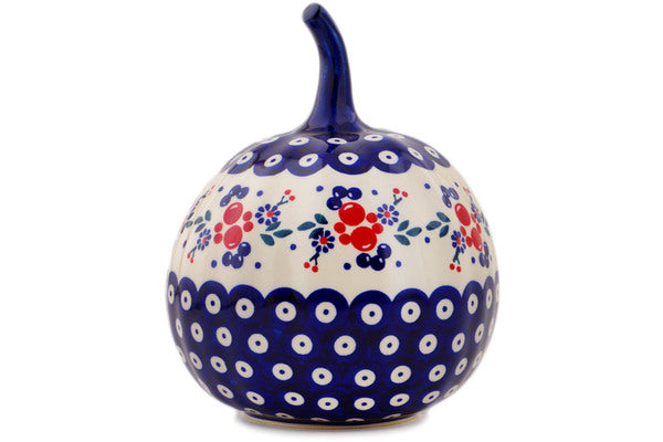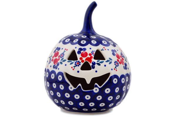 This Polish Pottery Jack O Lantern Candle Holder is handmade and handpainted by the Manufaktura factory in Boleslawiec, Poland. Manufacturer item number H8425Q. It is 5½" high and measures 6" by 5¾". The weight of this Jack O Lantern Candle Holder is 1.5 lbs. It is part of the Burst Of Berries Collection.