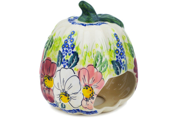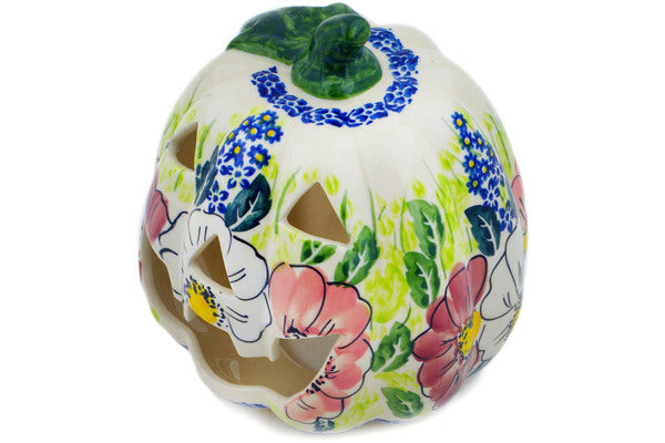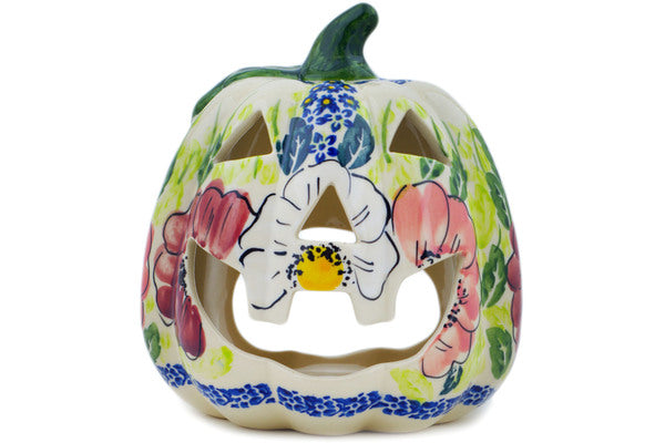 This Polish Pottery Jack O Lantern Candle Holder is handmade and handpainted by the Ceramika Nina factory in Boleslawiec, Poland. Manufacturer item number H1663P. It is 5¾" high and measures 5¼" by 4¾". The weight of this Jack O Lantern Candle Holder is 0.9 lbs. It is part of the Maroon Blossoms Collection.