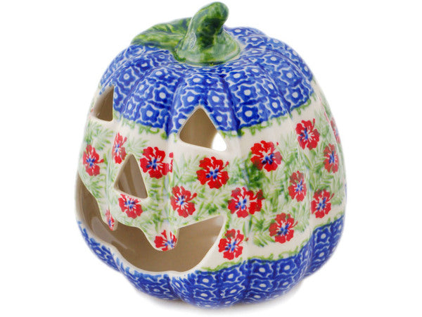 This Polish Pottery Jack O Lantern Candle Holder is handmade and handpainted by the Ceramika Bona factory in Boleslawiec, Poland. Manufacturer item number H3769P. It is 6" high and measures 5½" by 5". The weight of this Jack O Lantern Candle Holder is 1.3 lbs. It is part of the Midsummer Bloom Collection.