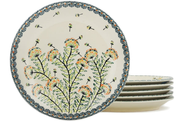 This Polish Pottery Set of 6 Plates is handmade and handpainted by the Zaklady Ceramiczne factory in Boleslawiec, Poland. Manufacturer item number H1041L. It is 1" high and measures 9½" by 9½". The weight of this Set of 6 Plates is 1.6 lbs. It is part of the Yellow Dandelions Collection.