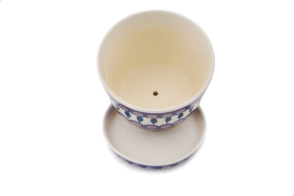 This Polish Pottery Planter is handmade and handpainted by the Manufaktura factory in Boleslawiec, Poland. Manufacturer item number H2654K. It is 5" high and measures 6" by 6". The weight of this Planter is 2.3 lbs. It is part of the Peacock Leaves Collection.