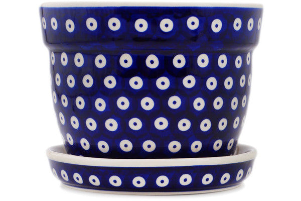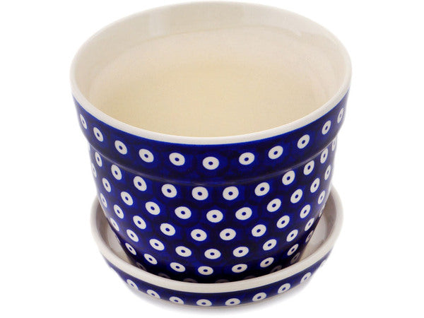 This Polish Pottery Planter is handmade and handpainted by the Manufaktura factory in Boleslawiec, Poland. Manufacturer item number H8310Q. It is 5" high and measures 6" by 6". The weight of this Planter is 2.3 lbs. It is part of the Peacock Eyes Collection.