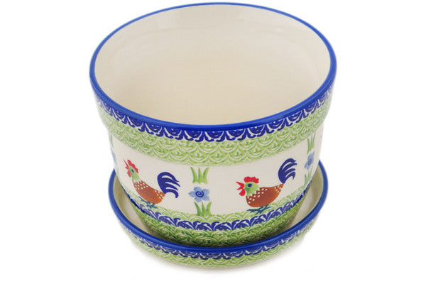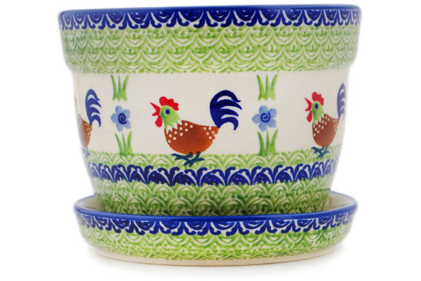 This Polish Pottery Planter is handmade and handpainted by the Manufaktura factory in Boleslawiec, Poland. Manufacturer item number H8321Q. It is 5" high and measures 6" by 6". The weight of this Planter is 2.3 lbs. It is part of the Rooster Strut Collection.