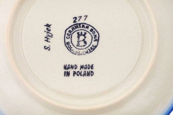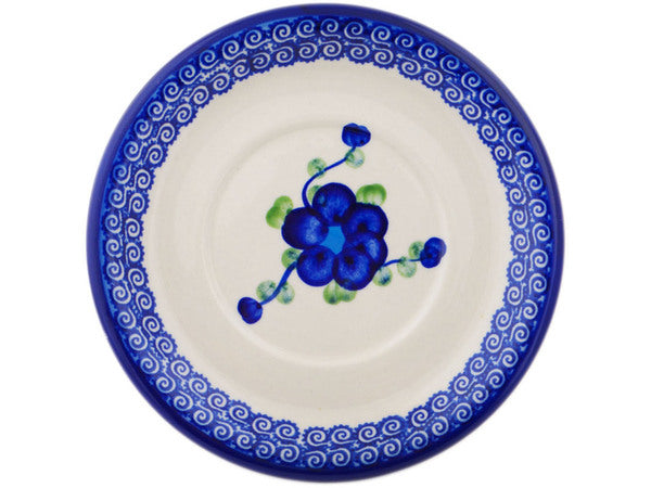 This Polish Pottery Saucer is handmade and handpainted by the Ceramika Bona factory in Boleslawiec, Poland. Manufacturer item number H5001P. It is ¾" high and measures 6½" by 6½". The capacity of this Saucer is 4.36 oz (brimful) and it weighs 0.6 lbs. It is part of the Blue Poppies Collection.
