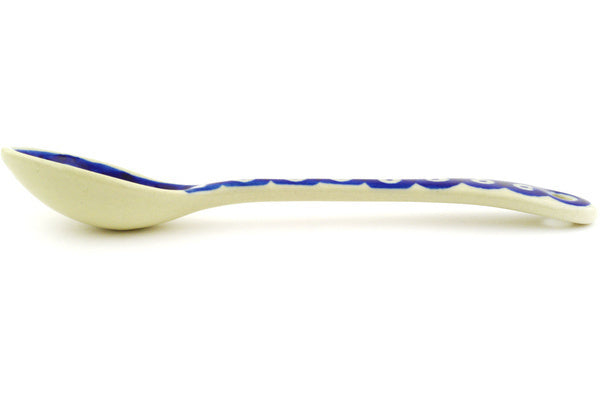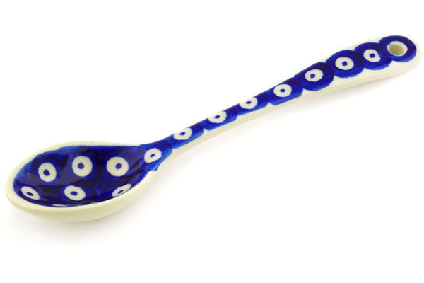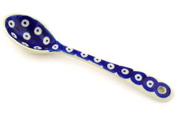 This Polish Pottery Spoon is handmade and handpainted by the Ceramika Bona factory in Boleslawiec, Poland. Manufacturer item number H9247F. It is ¾" high and measures 6" by 1½". The weight of this Spoon is 0.0 lbs. It is part of the Blue Eyed Peacock Collection.