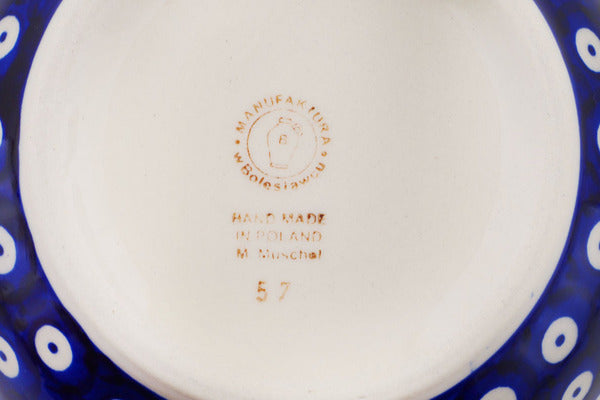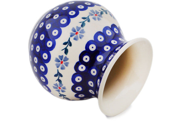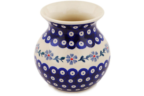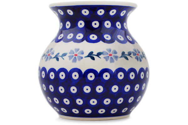 This Polish Pottery Vase is handmade and handpainted by the Manufaktura factory in Boleslawiec, Poland. Manufacturer item number H0839R. It is 5¾" high and measures 5¾" by 5¾". The capacity of this Vase is 42.88 oz (brimful) and it weighs 1.6 lbs. It is part of the Peacock Forget-Me-Not Collection.