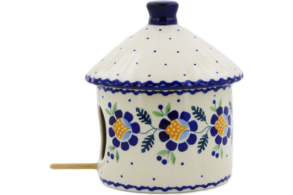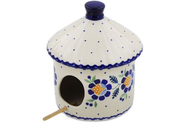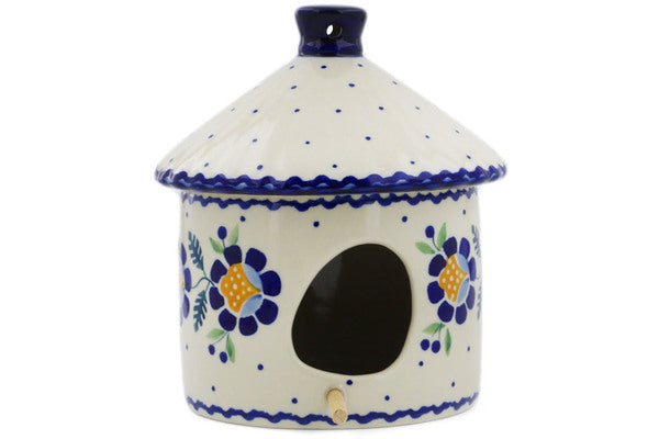 This Polish Pottery Birdhouse is handmade and handpainted by the Manufaktura factory in Boleslawiec, Poland. Manufacturer item number H3117K. It is 6½" high and measures 6¾" by 5¾". The weight of this Birdhouse is 1.9 lbs. It is part of the Orange And Blue Flower Collection.