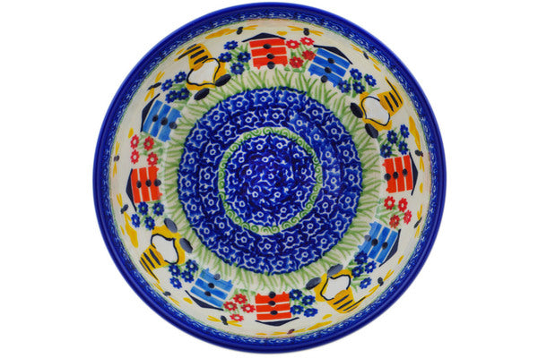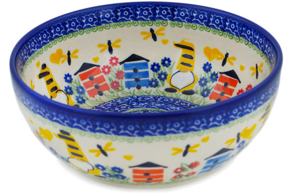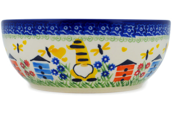This Polish Pottery Bowl is handmade and handpainted by the Ceramika Nina factory in Boleslawiec, Poland. Manufacturer item number H1561P. It is 2¾" high and measures 7" by 7". The capacity of this Bowl is 33.98 oz (brimful) and it weighs 1.4 lbs. It is part of the Beekeeper Gnome Collection.