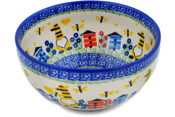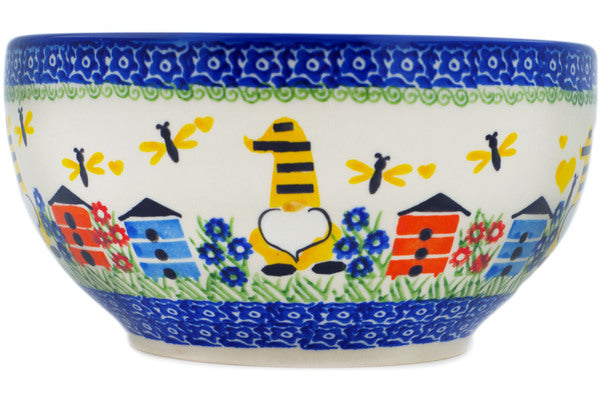 This Polish Pottery Bowl is handmade and handpainted by the Ceramika Nina factory in Boleslawiec, Poland. Manufacturer item number H2531P. It is 3¾" high and measures 7½" by 7½". The capacity of this Bowl is 50.72 oz (brimful) and it weighs 2.0 lbs. It is part of the Beekeeper Gnome Collection.