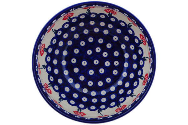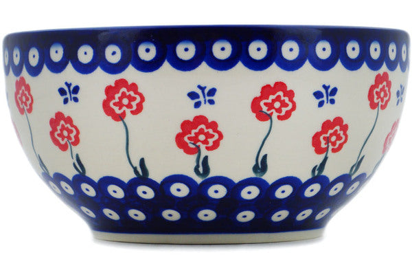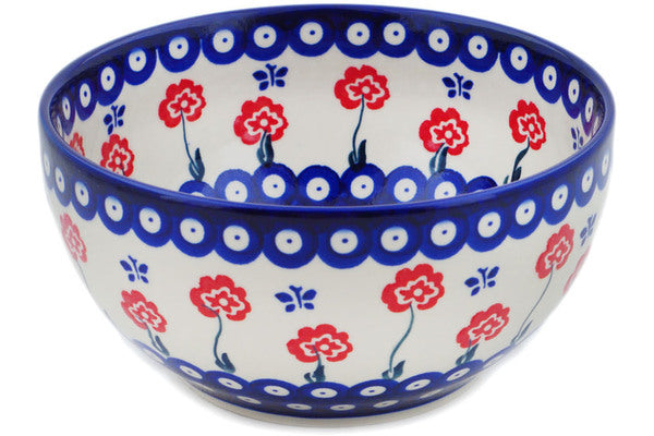 This Polish Pottery Bowl is handmade and handpainted by the Ceramika Bona factory in Boleslawiec, Poland. Manufacturer item number H6652O. It is 3¾" high and measures 7½" by 7½". The capacity of this Bowl is 50.72 oz (brimful) and it weighs 2.0 lbs. It is part of the Blue Eye Spring Collection.