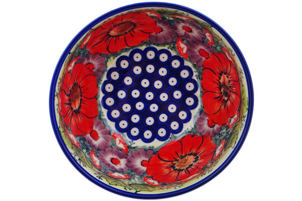 This Polish Pottery Bowl is handmade and handpainted by the Kaleta Ceramics factory in Boleslawiec, Poland. Manufacturer item number H6712P. It is 4" high and measures 7½" by 7¼". The capacity of this Bowl is 52.04 oz (brimful) and it weighs 1.8 lbs. It is part of the Blue Eyes Bouquet Collection.