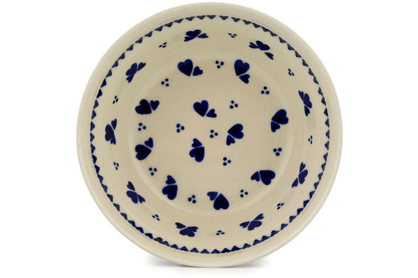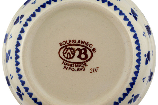 This Polish Pottery Bowl is handmade and handpainted by the Zaklady Ceramiczne factory in Boleslawiec, Poland. Manufacturer item number H9465C. It is 2½" high and measures 6½" by 6½". The capacity of this Bowl is 24.68 oz (brimful) and it weighs 1.2 lbs. It is part of the Blue Heart Trio Collection.