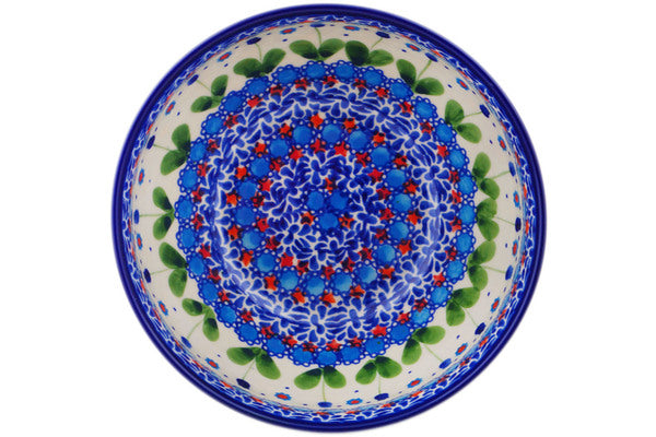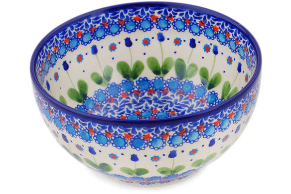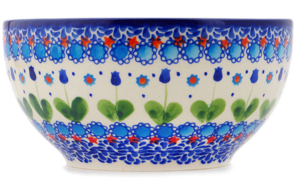 This Polish Pottery Bowl is handmade and handpainted by the Ceramika Bona factory in Boleslawiec, Poland. Manufacturer item number H3159R. It is 3¾" high and measures 7½" by 7½". The capacity of this Bowl is 50.72 oz (brimful) and it weighs 2.0 lbs. It is part of the Blue Tulip Garden Collection.