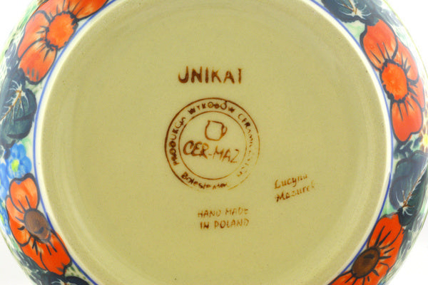 This is a Polish pottery Unikat (Signature) Bowl, which means that it has been hand painted with both sponges and brushes and it is signed by the artist who painted it. Unikat pieces are the most intricate works of art. Larger Unikat items take hours of very careful work to finish.