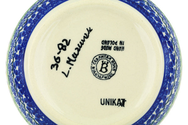 This is a Polish pottery Unikat (Signature) Bowl, which means that it has been hand painted with both sponges and brushes and it is signed by the artist who painted it. Unikat pieces are the most intricate works of art. Larger Unikat items take hours of very careful work to finish.