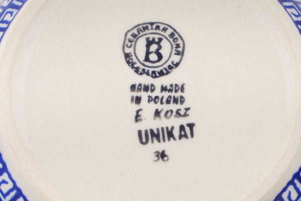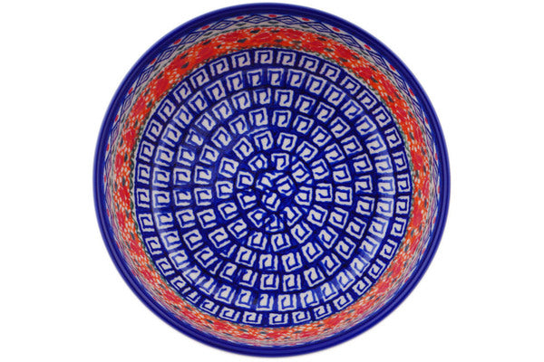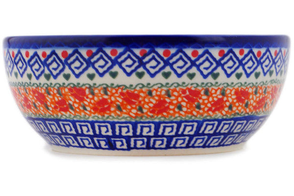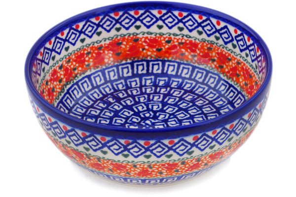 This Polish Pottery Bowl is handmade and handpainted by the Ceramika Bona factory in Boleslawiec, Poland. Manufacturer item number H9661Q. It is 2¾" high and measures 7" by 7". The capacity of this Bowl is 33.98 oz (brimful) and it weighs 1.4 lbs. It is part of the Grecian Fire Tulips Collection.