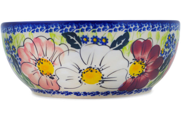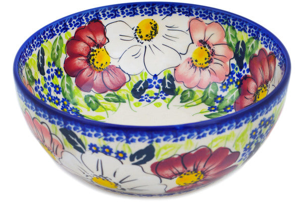 This Polish Pottery Bowl is handmade and handpainted by the Ceramika Nina factory in Boleslawiec, Poland. Manufacturer item number H2663P. It is 2¾" high and measures 7" by 7". The capacity of this Bowl is 33.98 oz (brimful) and it weighs 1.4 lbs. It is part of the Maroon Blossoms Collection.