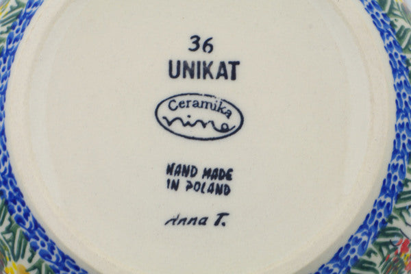 This is a Polish pottery Unikat (Signature) Bowl, which means that it has been hand painted with both sponges and brushes and it is signed by the artist who painted it. Unikat pieces are the most intricate works of art. Larger Unikat items take hours of very careful work to finish.
