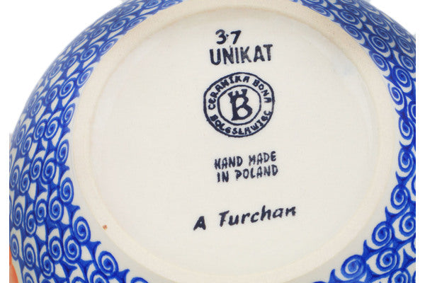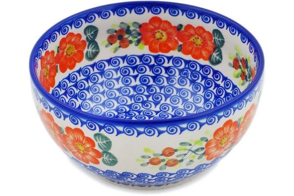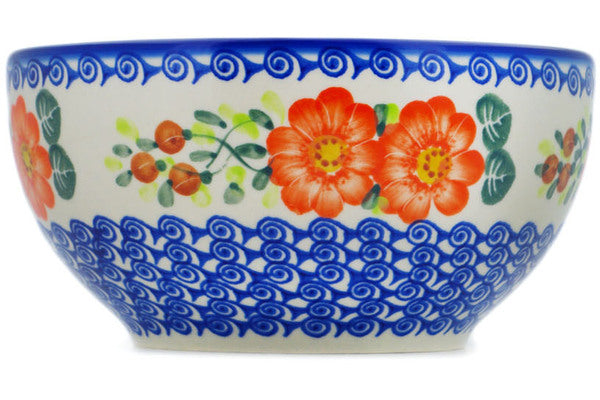 This Polish Pottery Bowl is handmade and handpainted by the Ceramika Bona factory in Boleslawiec, Poland. Manufacturer item number H7060P. It is 3¾" high and measures 7½" by 7½". The capacity of this Bowl is 50.72 oz (brimful) and it weighs 2.0 lbs. It is part of the Red Blossom Collection.