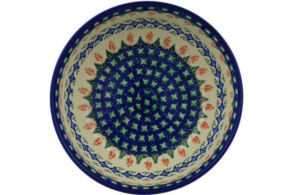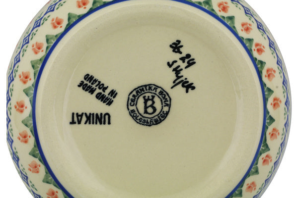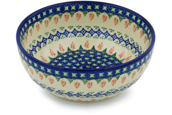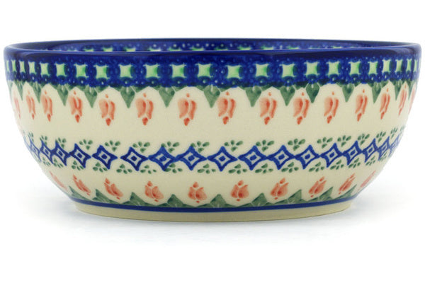 This Polish Pottery Bowl is handmade and handpainted by the Ceramika Bona factory in Boleslawiec, Poland. Manufacturer item number H8113G. It is 2¾" high and measures 7" by 7". The capacity of this Bowl is 33.98 oz (brimful) and it weighs 1.4 lbs. It is part of the Tulips And Diamonds Collection.