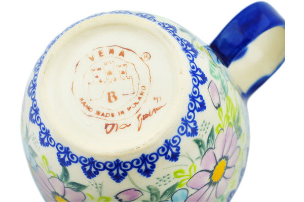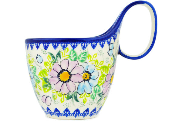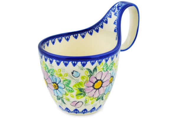 This Polish Pottery Bowl with Loop-Handle is handmade and handpainted by the Vena factory in Boleslawiec, Poland. Manufacturer item number H8783M. It is 6" high and measures 6¾" by 4½". The capacity of this Bowl with Loop-Handle is 19.07 oz (brimful) and it weighs 1.1 lbs. It is part of the Spring's Pastels Collection.