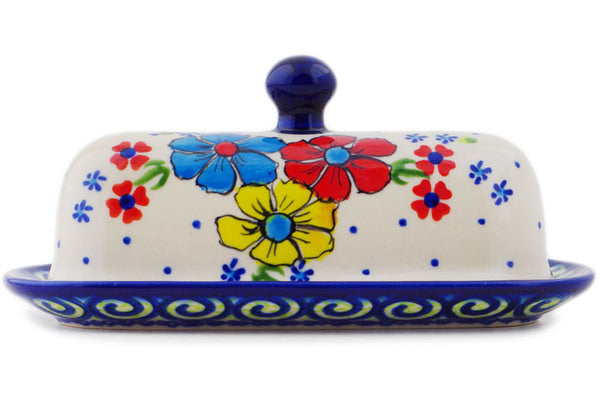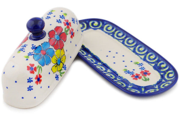 This Polish Pottery Butter Dish is handmade and handpainted by the Ceramika Bona factory in Boleslawiec, Poland. Manufacturer item number H2178R. It is 3" high and measures 7¼" by 3½". The weight of this Butter Dish is 0.8 lbs. It is part of the Country Three Collection.