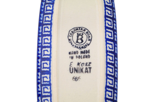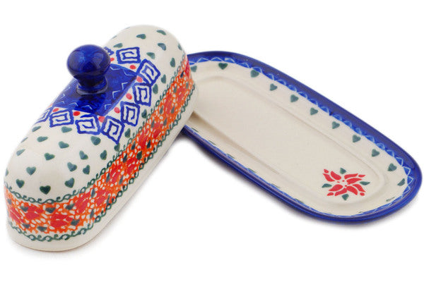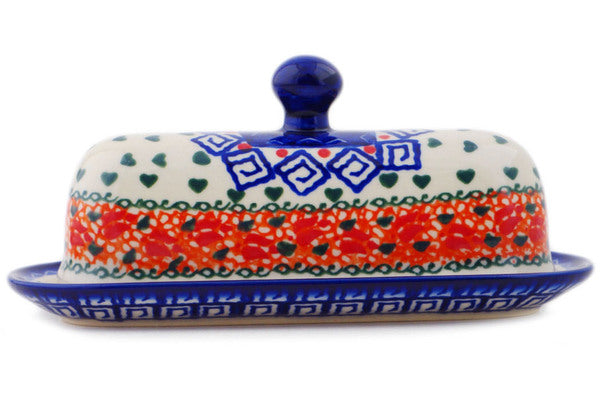 This Polish Pottery Butter Dish is handmade and handpainted by the Ceramika Bona factory in Boleslawiec, Poland. Manufacturer item number H9697Q. It is 3" high and measures 7¼" by 3½". The weight of this Butter Dish is 0.8 lbs. It is part of the Grecian Fire Tulips Collection.