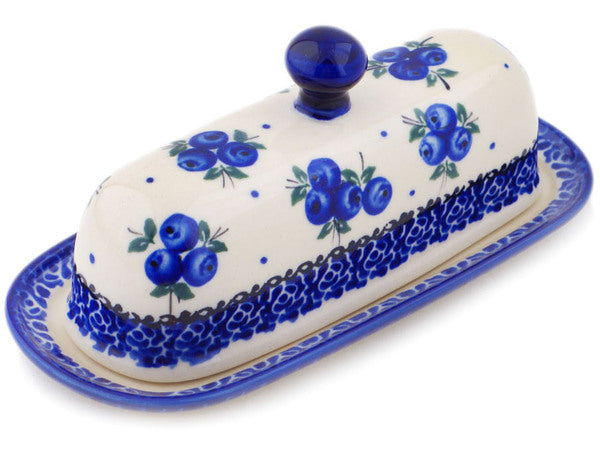 This Polish Pottery Butter Dish is handmade and handpainted by the Ceramika Bona factory in Boleslawiec, Poland. Manufacturer item number H3030Q. It is 3" high and measures 7¼" by 3½". The weight of this Butter Dish is 0.8 lbs. It is part of the Lovely Blueberries Collection.