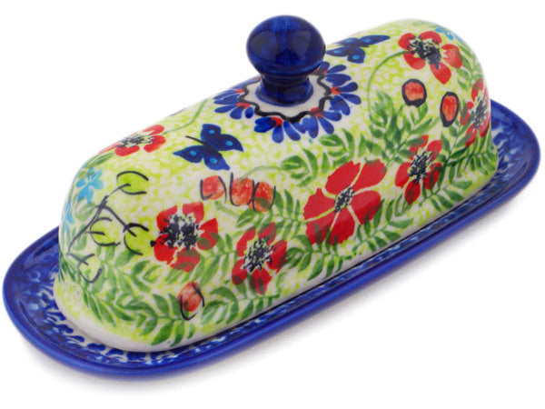 This Polish Pottery Butter Dish is handmade and handpainted by the Ceramika Bona factory in Boleslawiec, Poland. Manufacturer item number H8723Q. It is 3" high and measures 7¼" by 3½". The weight of this Butter Dish is 0.8 lbs. It is part of the Metamorphosis Collection.