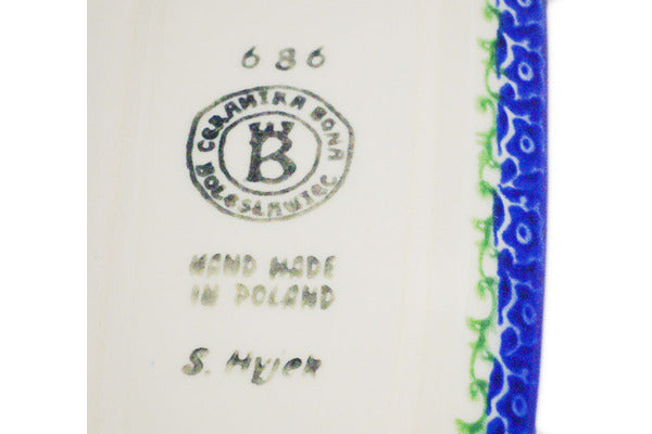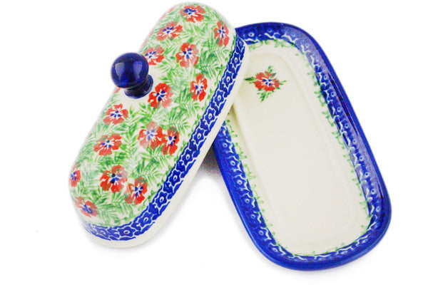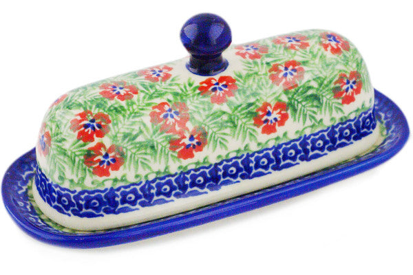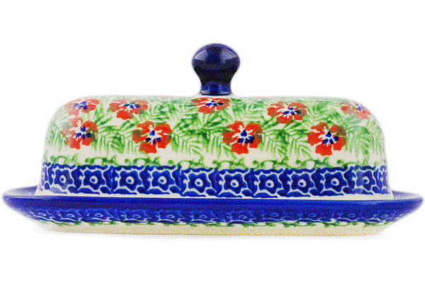 This Polish Pottery Butter Dish is handmade and handpainted by the Ceramika Bona factory in Boleslawiec, Poland. Manufacturer item number H2452R. It is 3" high and measures 7¼" by 3½". The weight of this Butter Dish is 0.8 lbs. It is part of the Midsummer Bloom Collection.