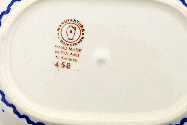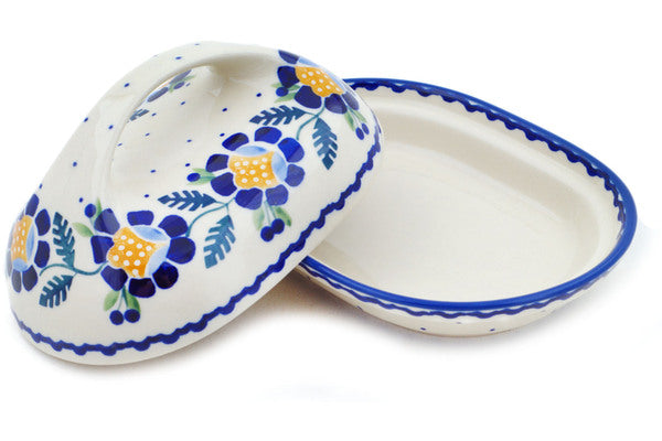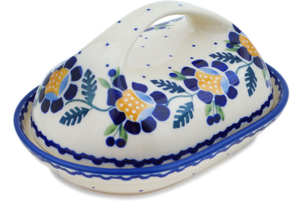 This Polish Pottery Butter Dish is handmade and handpainted by the Manufaktura factory in Boleslawiec, Poland. Manufacturer item number H0299O. It is 3¾" high and measures 7" by 5". The weight of this Butter Dish is 1.5 lbs. It is part of the Orange And Blue Flower Collection.
