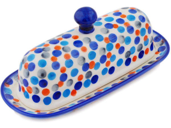 This Polish Pottery Butter Dish is handmade and handpainted by the Ceramika Bona factory in Boleslawiec, Poland. Manufacturer item number H2218R. It is 3" high and measures 7¼" by 3½". The weight of this Butter Dish is 0.8 lbs. It is part of the Polka Dot Frenzy Collection.