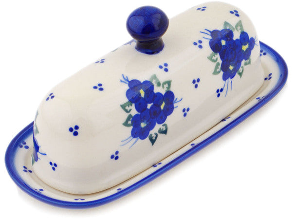 This Polish Pottery Butter Dish is handmade and handpainted by the Ceramika Bona factory in Boleslawiec, Poland. Manufacturer item number H9547Q. It is 3" high and measures 7¼" by 3½". The weight of this Butter Dish is 0.8 lbs. It is part of the Poppy Triad Collection.