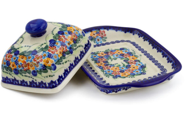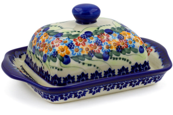 This Polish Pottery Butter Dish is handmade and handpainted by the Two People factory in Boleslawiec, Poland. Manufacturer item number H7213J. It is 3¼" high and measures 7½" by 5½". The weight of this Butter Dish is 1.4 lbs. It is part of the Starburst Garland Collection.
