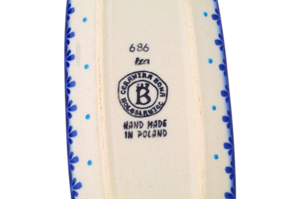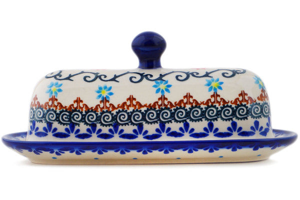 This Polish Pottery Butter Dish is handmade and handpainted by the Ceramika Bona factory in Boleslawiec, Poland. Manufacturer item number H4434Q. It is 3" high and measures 7¼" by 3½". The weight of this Butter Dish is 0.8 lbs. It is part of the Sunflower Dance Collection.