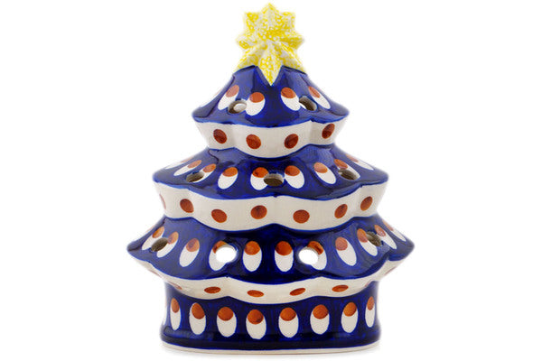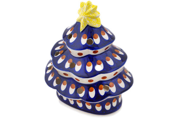 This Polish Pottery Christmas Tree Candle Holder is handmade and handpainted by the Manufaktura factory in Boleslawiec, Poland. Manufacturer item number H1156A. It is 7½" high and measures 6¼" by 4¾". The weight of this Christmas Tree Candle Holder is 1.7 lbs. It is part of the American Peacock Collection.